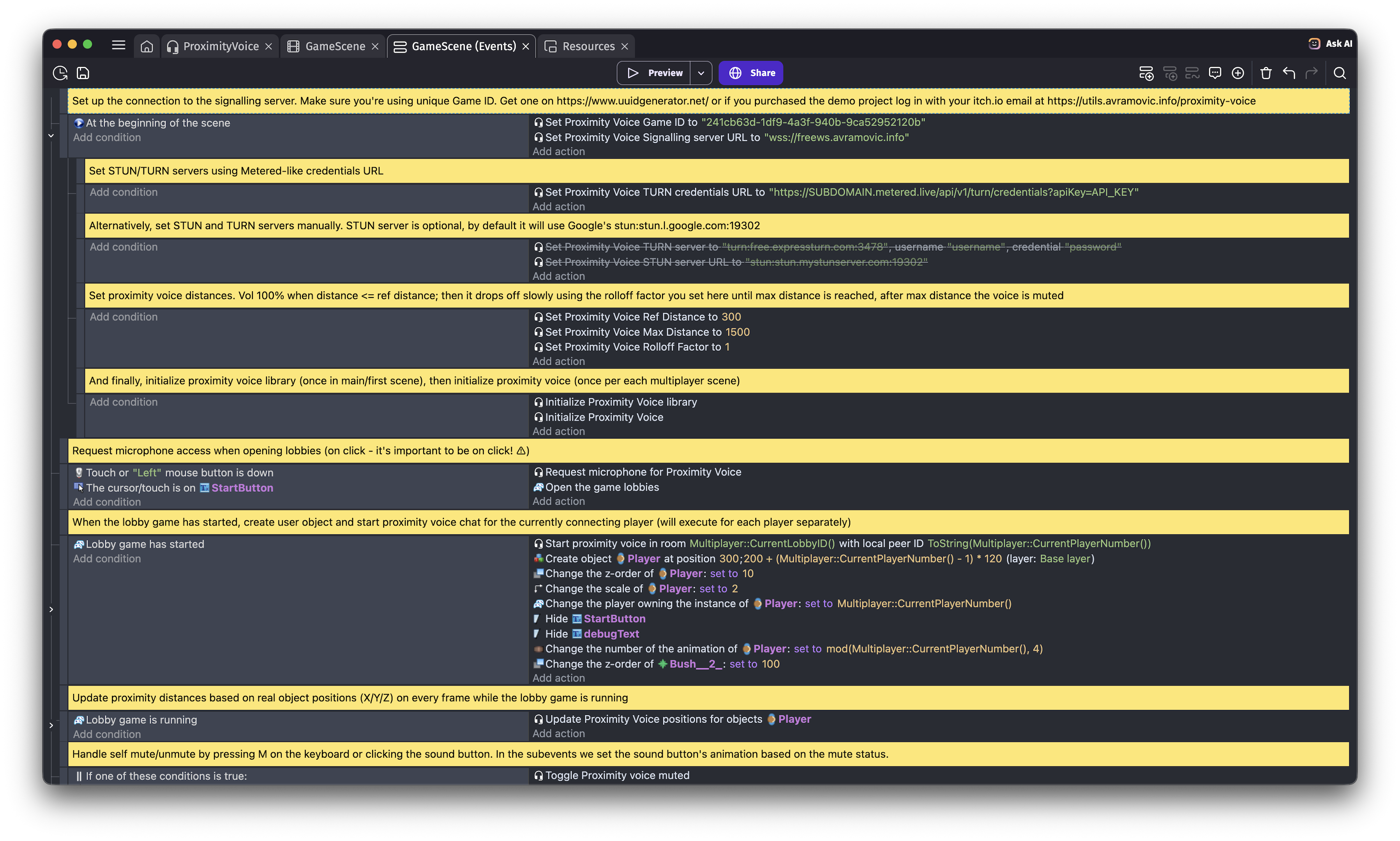 | Actions | Initialize library, Initialize Proximity Voice, Set Signalling/STUN/TURN URLs, Request microphone, Start/Stop proximity voice, Mute/Unmute, Mute remote players, Toggle proximity mode, Set global volume, Set distance curve (Ref/Max/Rolloff), Update positions, Host migration, Set Game ID, Set debug |