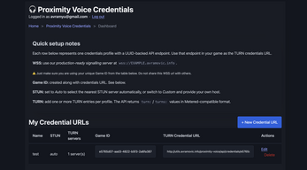 wss://freews.avramovic.info(set a unique Game ID using Set Proximity Voice Game ID) - $5 Demo Project + Credentials Dashboard + Private Signalling Server — Complete ready-to-run project + dynamic TURN/STUN management + private premium signalling server isolated from free users